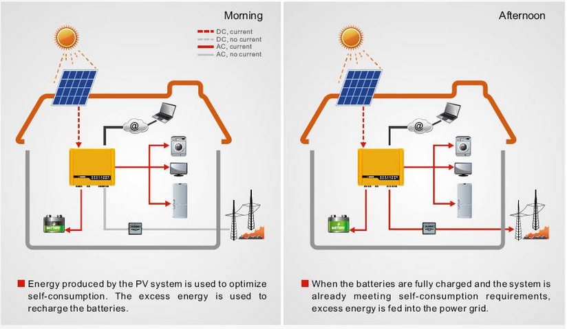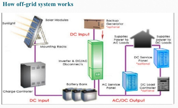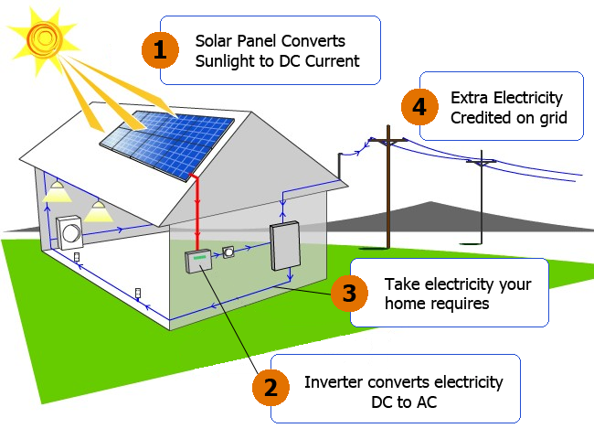 - Step-1: It works as both the off-grid and on-grid systems – during the day when the sun is shining brightly, the panels convert the rays to electricity and any excess will be stored in the batteries, much like the off-grid systems. However, if even after storing in batteries and using electricity in your home, there is still excess power, the system then sends this excess back to the grid according to the rate of the chosen feed in tariff, similar to the on-grid system.