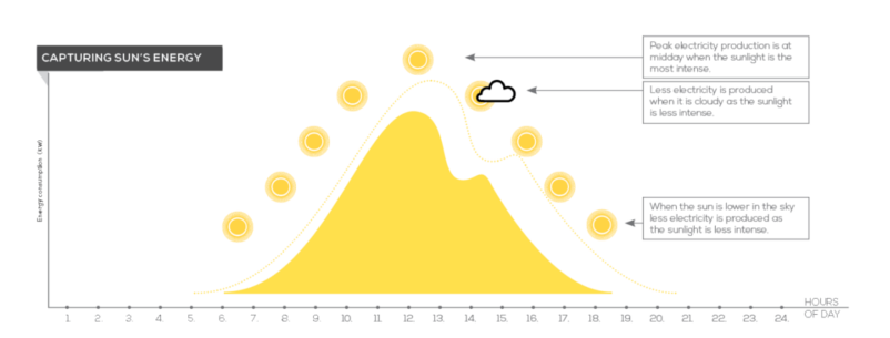 The more intense the sunlight that shines on your solar PV panels the more electricity that is produced, so when the sun is low in the sky less electricity is produced. Likewise on cloudy days and overcast days, less electricity is produced than on a bright sunny day. In the winter less electrical energy is produced than during the summer as the sun shines for less hours. the dotted line represents the increased electricity production on a summers day.