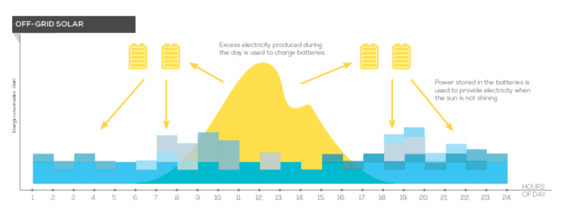 In the diagram above you can see how surplus electricity produced during the day is used to charge batteries which in turn produce electricity to run the house in the evening. As a general rule we design our systems to have enough battery storage so a household can last without significant sunshine for 2-3 days.